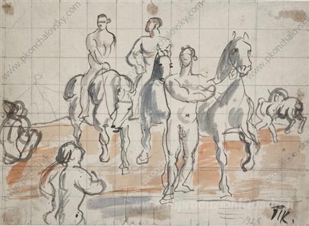 Ti offriamo una riproduzione artigianale su tela dell'opera famosa 'Schizzo di composizione per la pittura 'Bathing cavalleria'' di Pyotr Konchalovsky, dal Museo delle Riproduzioni.
