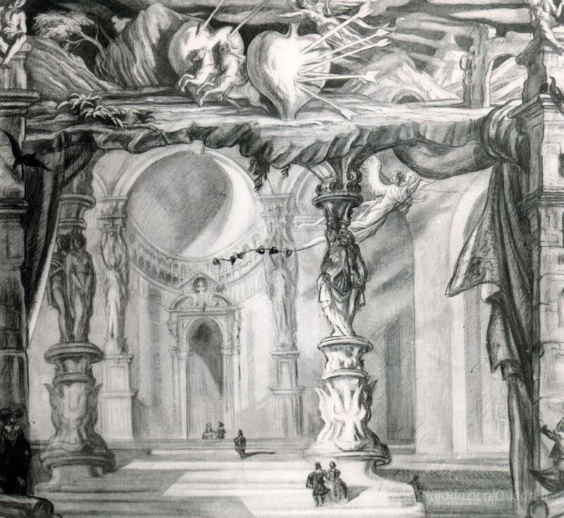 Ti offriamo una riproduzione artigianale su tela dell'opera famosa 'Schizzo di Cortina per la rappresentazione di Don Giovanni Tenor' di Carlos Saenz de Tejada, dal Museo delle Riproduzioni.