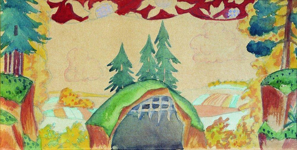 Ti offriamo una riproduzione artigianale su tela dell'opera famosa 'Schizzo di decorazioni per spettacolo di burattini "Il Gallo - G' di Boris Kustodiev, dal Museo delle Riproduzioni.
