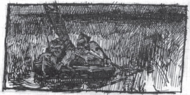Ti offriamo una riproduzione artigianale su tela dell'opera famosa 'Schizzo di due cacciatori in barca' di Nicholas Roerich, dal Museo delle Riproduzioni.