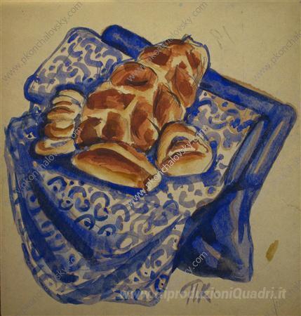 Ti offriamo una riproduzione artigianale su tela dell'opera famosa 'Schizzo di natura morta con pane' di Pyotr Konchalovsky, dal Museo delle Riproduzioni.
