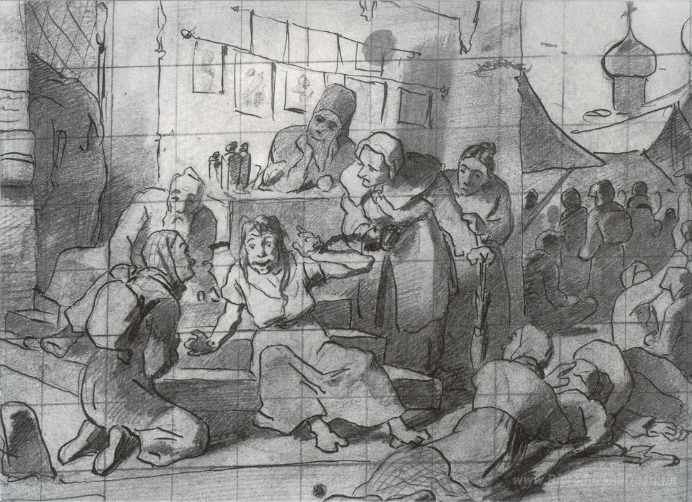 Ti offriamo una riproduzione artigianale su tela dell'opera famosa 'Sciocco Santo, circondato da pellegrini' di Vasily Perov, dal Museo delle Riproduzioni.