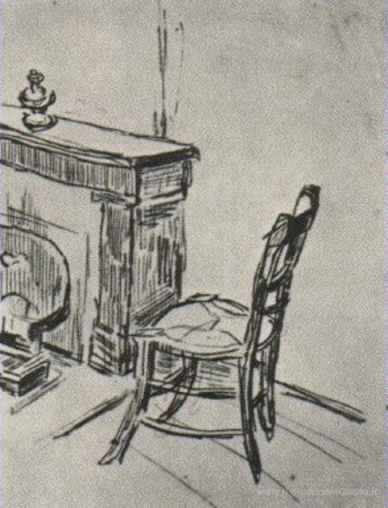 Ti offriamo una riproduzione artigianale su tela dell'opera famosa 'Sedia vicino alla stufa' di Vincent van Gogh, dal Museo delle Riproduzioni.