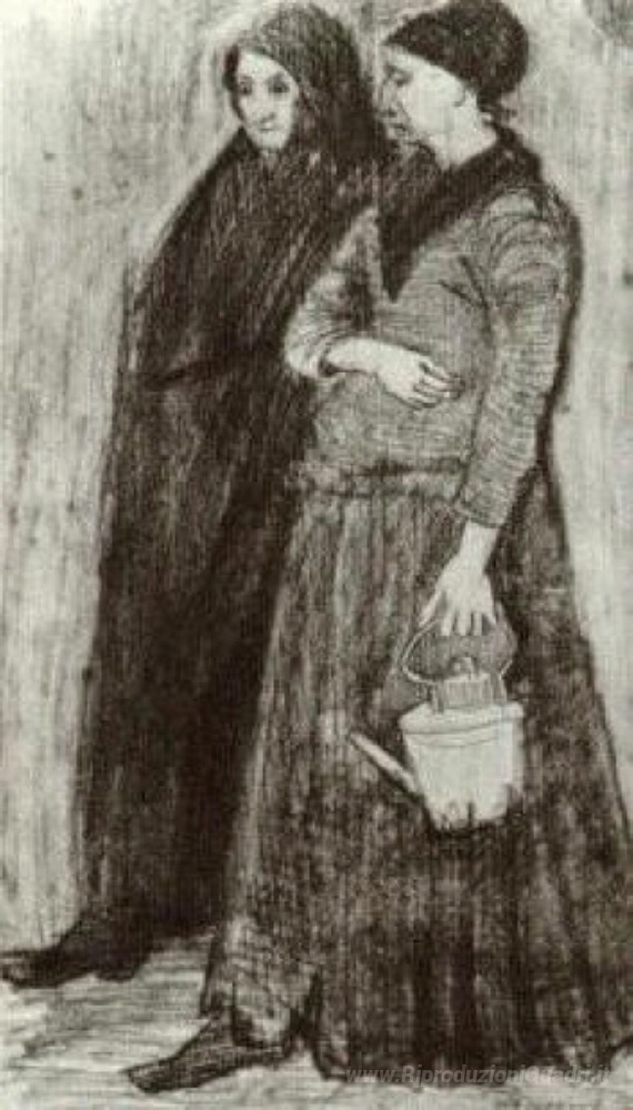 Ti offriamo una riproduzione artigianale su tela dell'opera famosa 'Sien Incinta, Camminare con donna più anziana' di Vincent van Gogh, dal Museo delle Riproduzioni.
