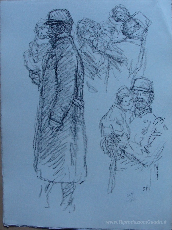 Ti offriamo una riproduzione artigianale su tela dell'opera famosa 'Soldat en kepi portant un enfant' di Theophile Steinlen, dal Museo delle Riproduzioni.