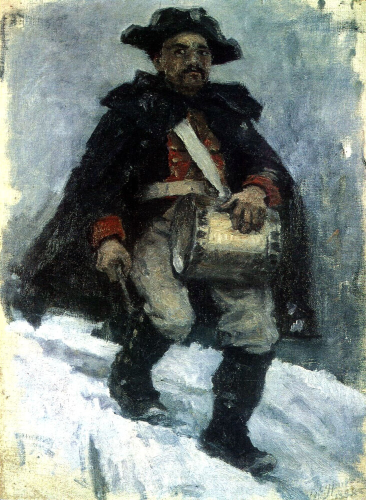 Ti offriamo una riproduzione artigianale su tela dell'opera famosa 'Soldato con tamburo' di Vasily Surikov, dal Museo delle Riproduzioni.
