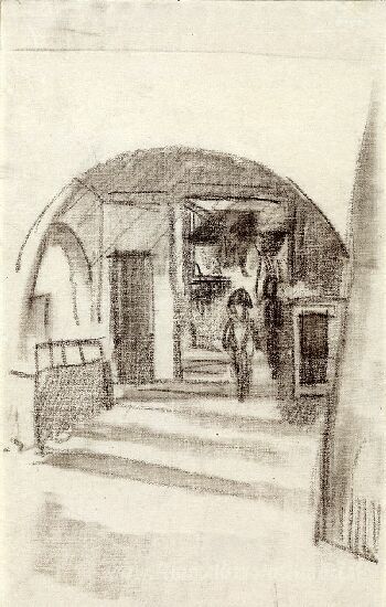 Ti offriamo una riproduzione artigianale su tela dell'opera famosa 'Sotto i portici' di August Macke, dal Museo delle Riproduzioni.