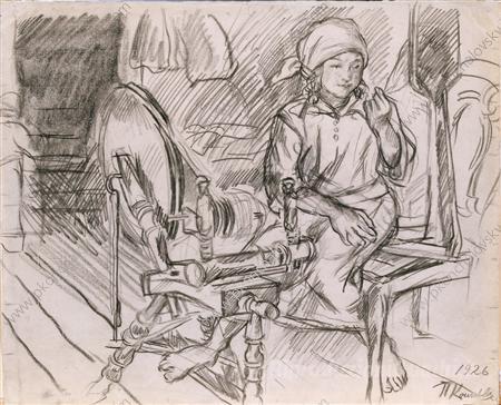 Ti offriamo una riproduzione artigianale su tela dell'opera famosa 'Spinner. Disegno per il dipinto 'filatore'.' di Pyotr Konchalovsky, dal Museo delle Riproduzioni.