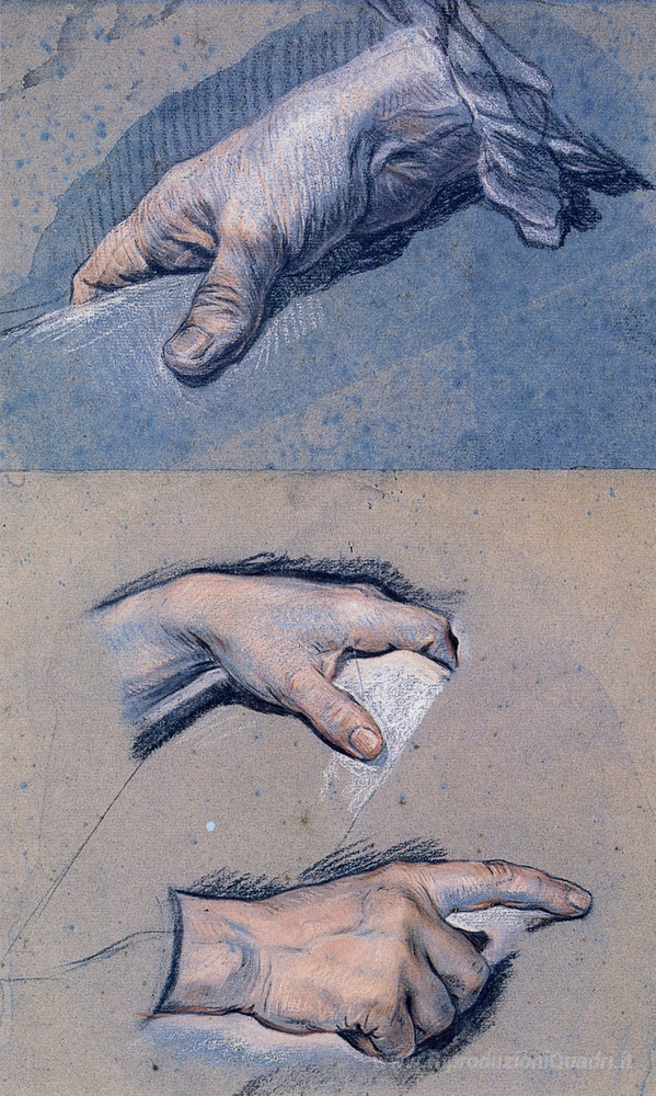 Ti offriamo una riproduzione artigianale su tela dell'opera famosa 'Studi di mani degli uomini' di Maurice Quentin de La Tour, dal Museo delle Riproduzioni.