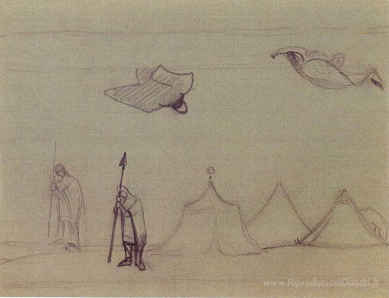 Ti offriamo una riproduzione artigianale su tela dell'opera famosa 'Studiare a "Tappeto Volante"' di Nicholas Roerich, dal Museo delle Riproduzioni.