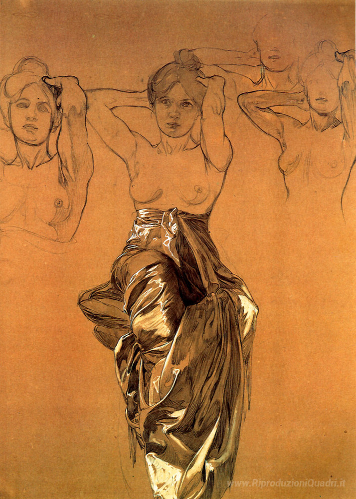 Ti offriamo una riproduzione artigianale su tela dell'opera famosa 'Studio di Drapery' di Alphonse Mucha, dal Museo delle Riproduzioni.