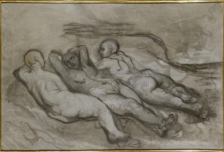 Ti offriamo una riproduzione artigianale su tela dell'opera famosa 'Studio di tre donne nude che si trova ai piedi di una rupe' di Honore Daumier, dal Museo delle Riproduzioni.