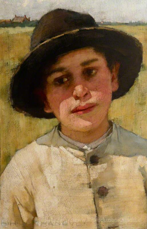 Ti offriamo una riproduzione artigianale su tela dell'opera famosa 'Studio di un ragazzo in un cappello nero, prima di un campo di g' di Henry Herbert La Thangue, dal Museo delle Riproduzioni.