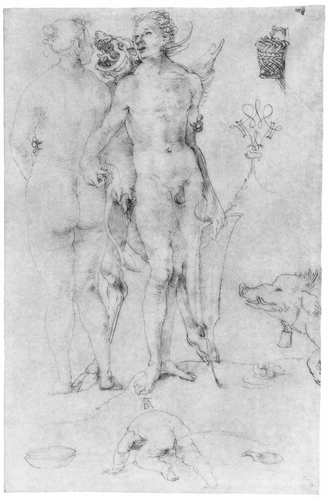 Ti offriamo una riproduzione artigianale su tela dell'opera famosa 'Studio Journal, coppia nuda e il Diavolo' di Albrecht Durer, dal Museo delle Riproduzioni.