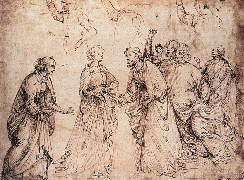 Ti offriamo una riproduzione artigianale su tela dell'opera famosa 'Studio' di Domenico Ghirlandaio, dal Museo delle Riproduzioni.