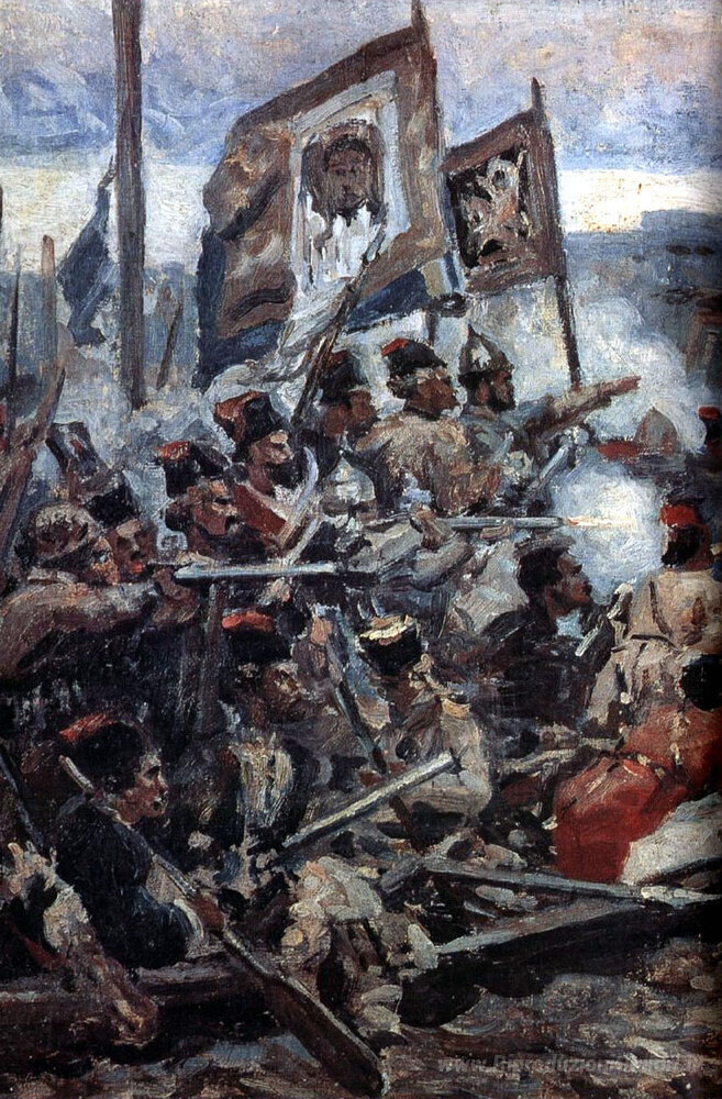 Ti offriamo una riproduzione artigianale su tela dell'opera famosa 'Studio per "La conquista della Siberia da parte Yermak"' di Vasily Surikov, dal Museo delle Riproduzioni.