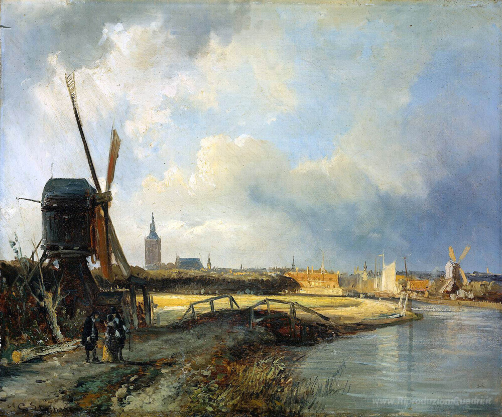 Ti offriamo una riproduzione artigianale su tela dell'opera famosa 'Studio per View su Den Haag' di Cornelis Springer, dal Museo delle Riproduzioni.