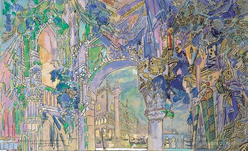 Ti offriamo una riproduzione artigianale su tela dell'opera famosa 'The Curtain Sketch del dramma La Ronde des Heures' di Konstantin Korovin, dal Museo delle Riproduzioni.