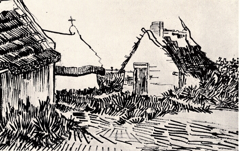 Ti offriamo una riproduzione artigianale su tela dell'opera famosa 'Tre Case a Saintes-Maries' di Vincent van Gogh, dal Museo delle Riproduzioni.