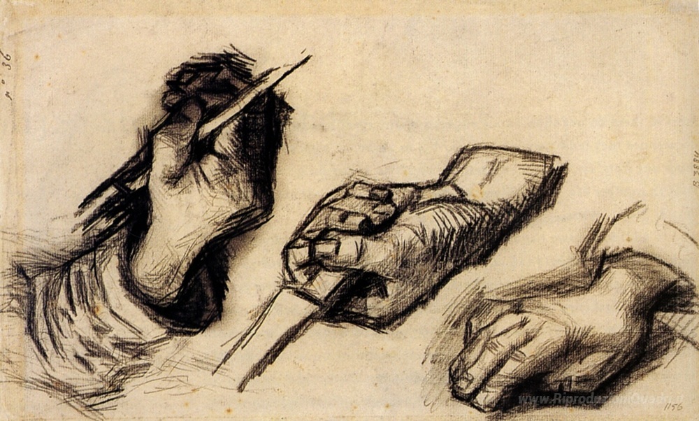 Ti offriamo una riproduzione artigianale su tela dell'opera famosa 'Tre Mani, Due con coltelli' di Vincent van Gogh, dal Museo delle Riproduzioni.