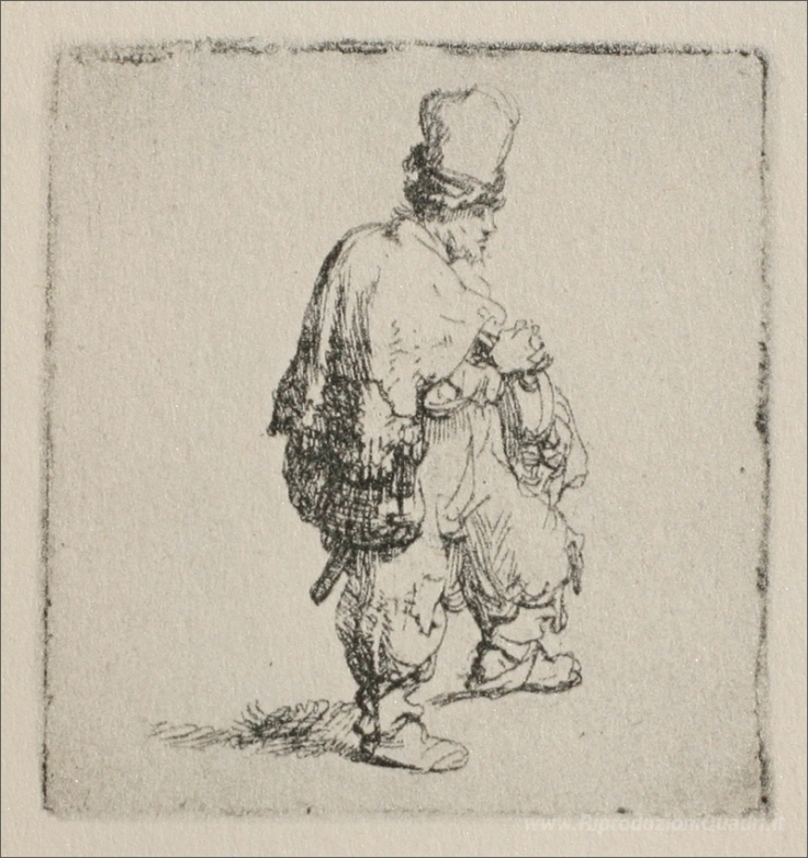 Ti offriamo una riproduzione artigianale su tela dell'opera famosa 'Un Polander Camminando verso destra' di Rembrandt, dal Museo delle Riproduzioni.
