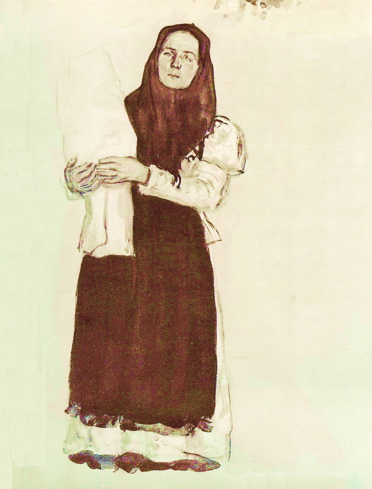 Ti offriamo una riproduzione artigianale su tela dell'opera famosa 'Una giovane donna contadina in una sciarpa rossa' di Konstantin Yuon, dal Museo delle Riproduzioni.