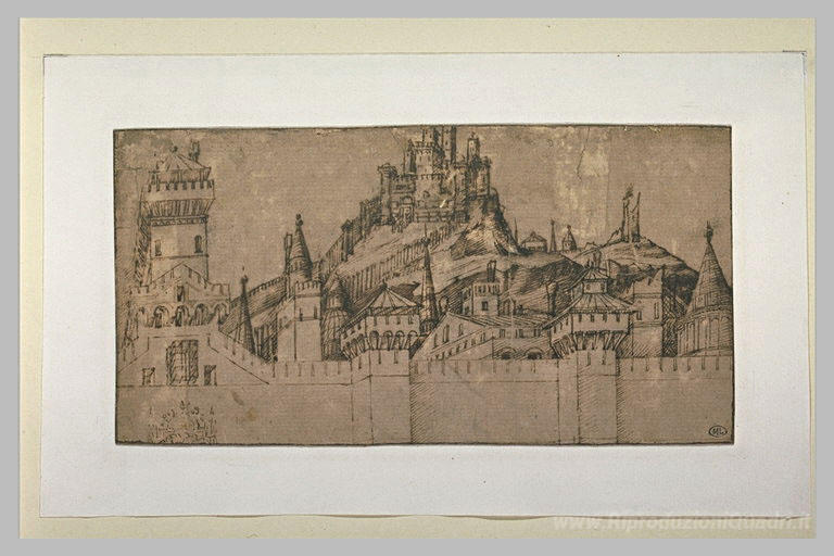 Ti offriamo una riproduzione artigianale su tela dell'opera famosa 'Vista di una fortificazione di Gerusalemme' di Jacopo Bellini, dal Museo delle Riproduzioni.