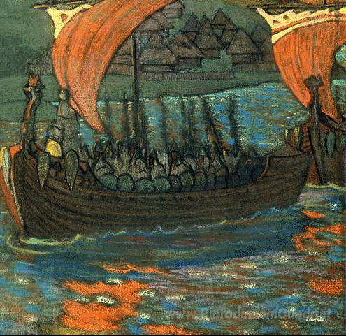 Ti offriamo una riproduzione artigianale su tela dell'opera famosa 'Barche' di Nicholas Roerich, dal Museo delle Riproduzioni.