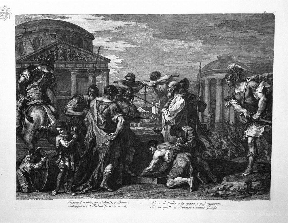 Ti offriamo una riproduzione artigianale su tela dell'opera famosa 'Brenno e Camillo' di Giovanni Battista Piranesi, dal Museo delle Riproduzioni.