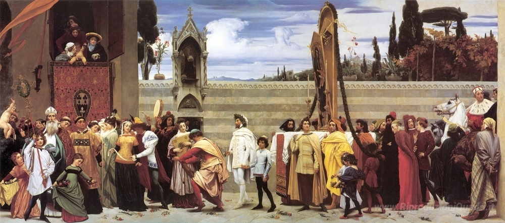 Ti offriamo una riproduzione artigianale su tela dell'opera famosa 'Celebrato Madonna di Cimabue viene portata in processione per le' di Frederic Leighton, dal Museo delle Riproduzioni.