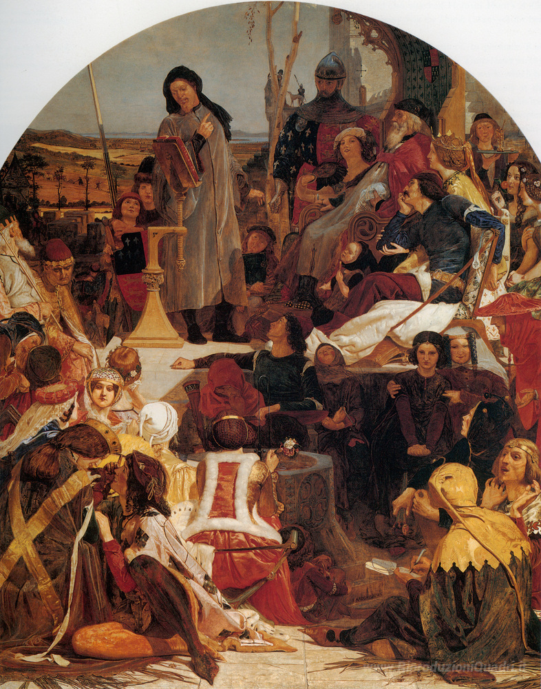 Ti offriamo una riproduzione artigianale su tela dell'opera famosa 'Chaucer alla corte di Edoardo III' di Ford Madox Brown, dal Museo delle Riproduzioni.