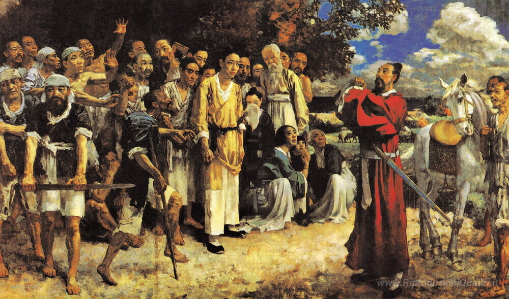Ti offriamo una riproduzione artigianale su tela dell'opera famosa 'Cinquecento eroi di Tianheng' di Xu Beihong, dal Museo delle Riproduzioni.