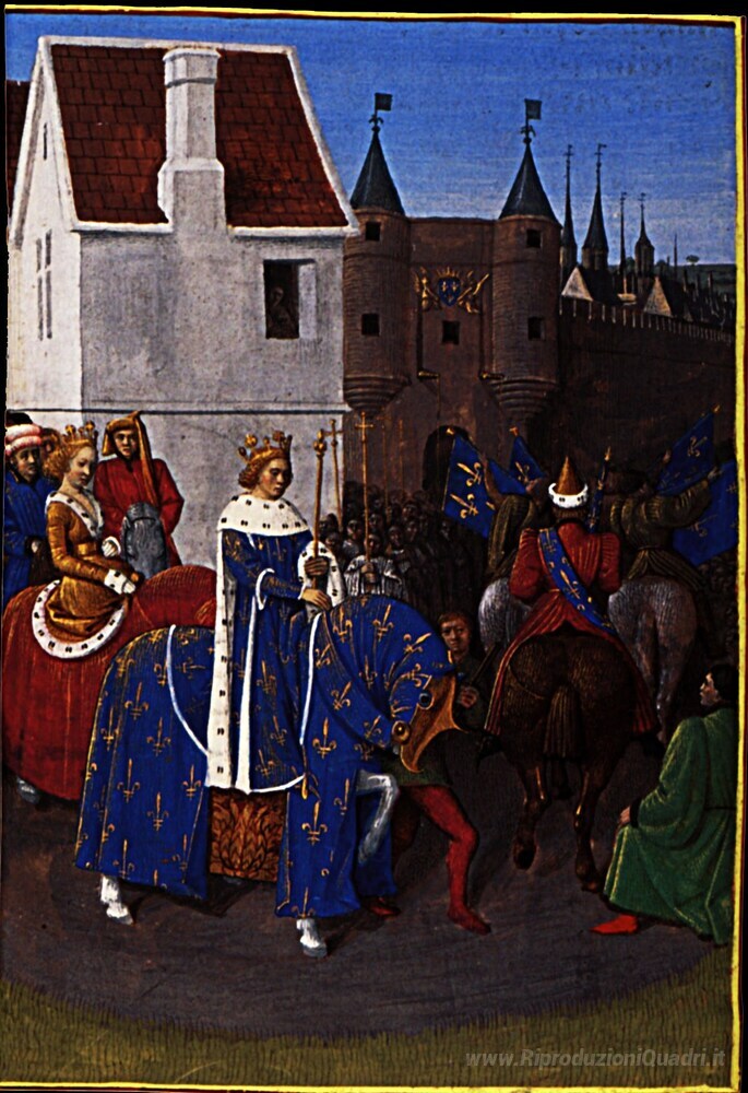 Ti offriamo una riproduzione artigianale su tela dell'opera famosa 'Entrata di Jean Le Bon a Parigi' di Jean Fouquet, dal Museo delle Riproduzioni.
