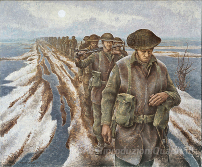 Ti offriamo una riproduzione artigianale su tela dell'opera famosa 'Fanteria a Nijmegen' di Alex Colville, dal Museo delle Riproduzioni.