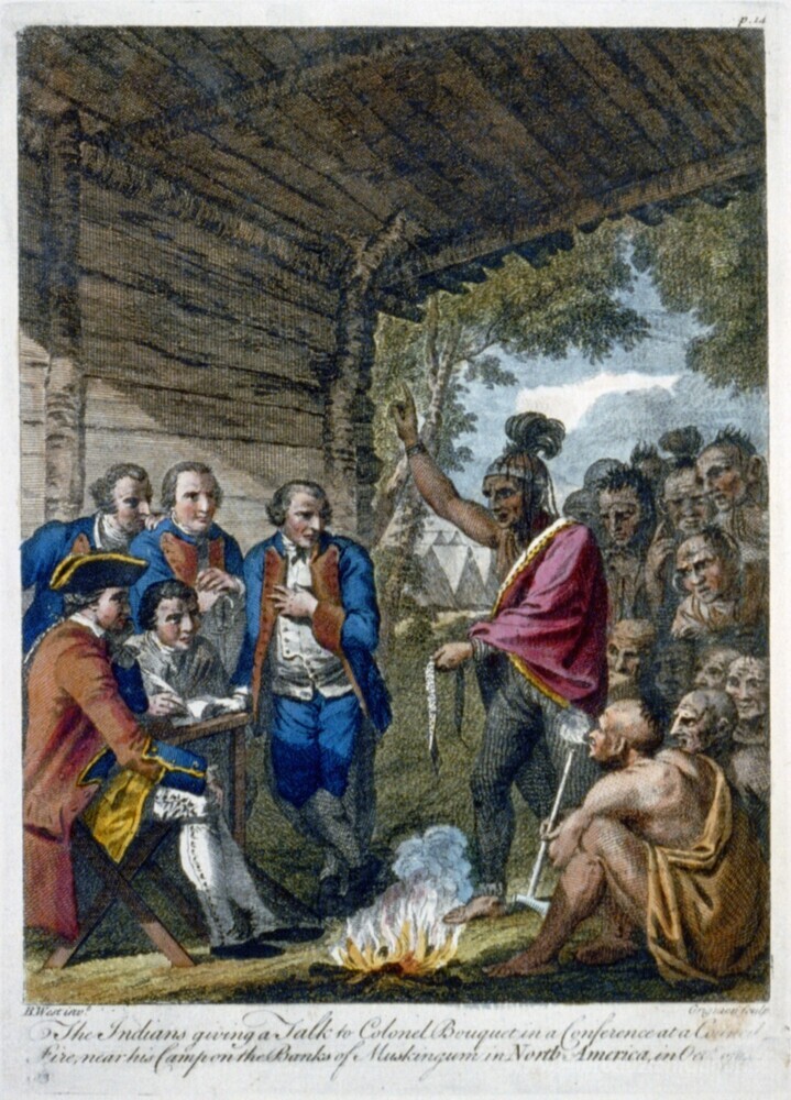 Ti offriamo una riproduzione artigianale su tela dell'opera famosa 'Gli indiani che danno un discorso al colonnello Bouquet in una c' di Benjamin West, dal Museo delle Riproduzioni.
