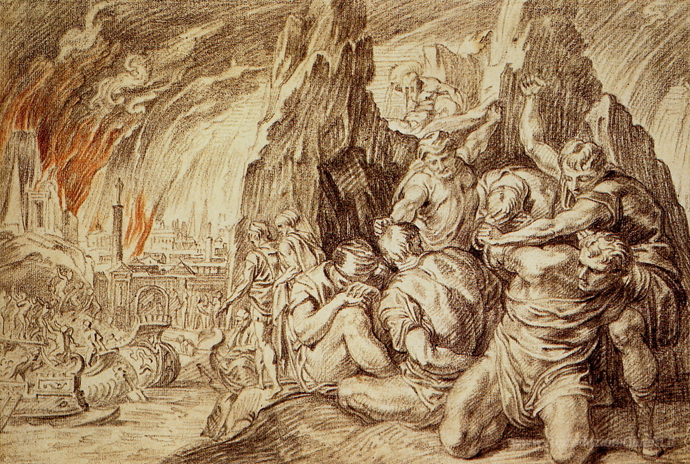 Ti offriamo una riproduzione artigianale su tela dell'opera famosa 'I Greci Lasciare dopo l'incendio di Troia' di Theodoor van Thulden, dal Museo delle Riproduzioni.