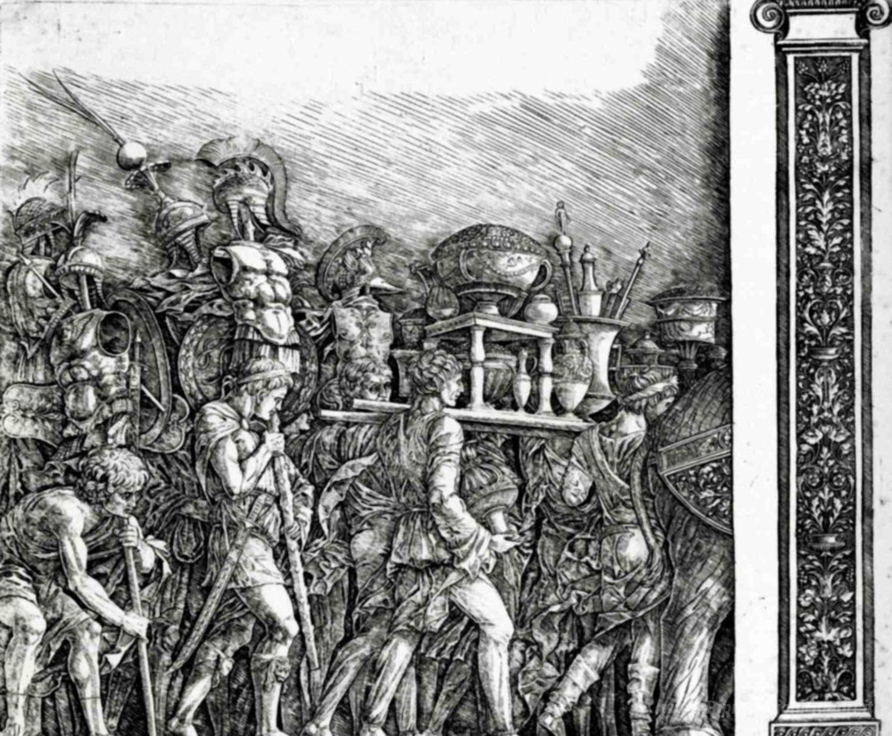 Ti offriamo una riproduzione artigianale su tela dell'opera famosa 'I titolari di valute e gioielli d'oro, trofei armatura reale con' di Andrea Mantegna, dal Museo delle Riproduzioni.