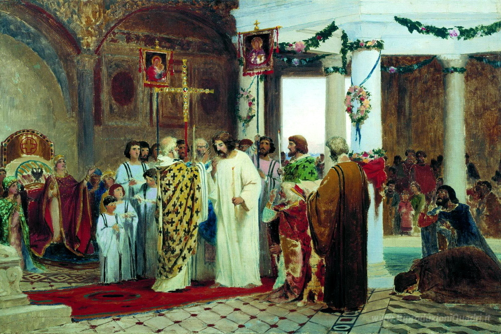 Ti offriamo una riproduzione artigianale su tela dell'opera famosa 'Il battesimo del principe Vladimir' di Fyodor Bronnikov, dal Museo delle Riproduzioni.