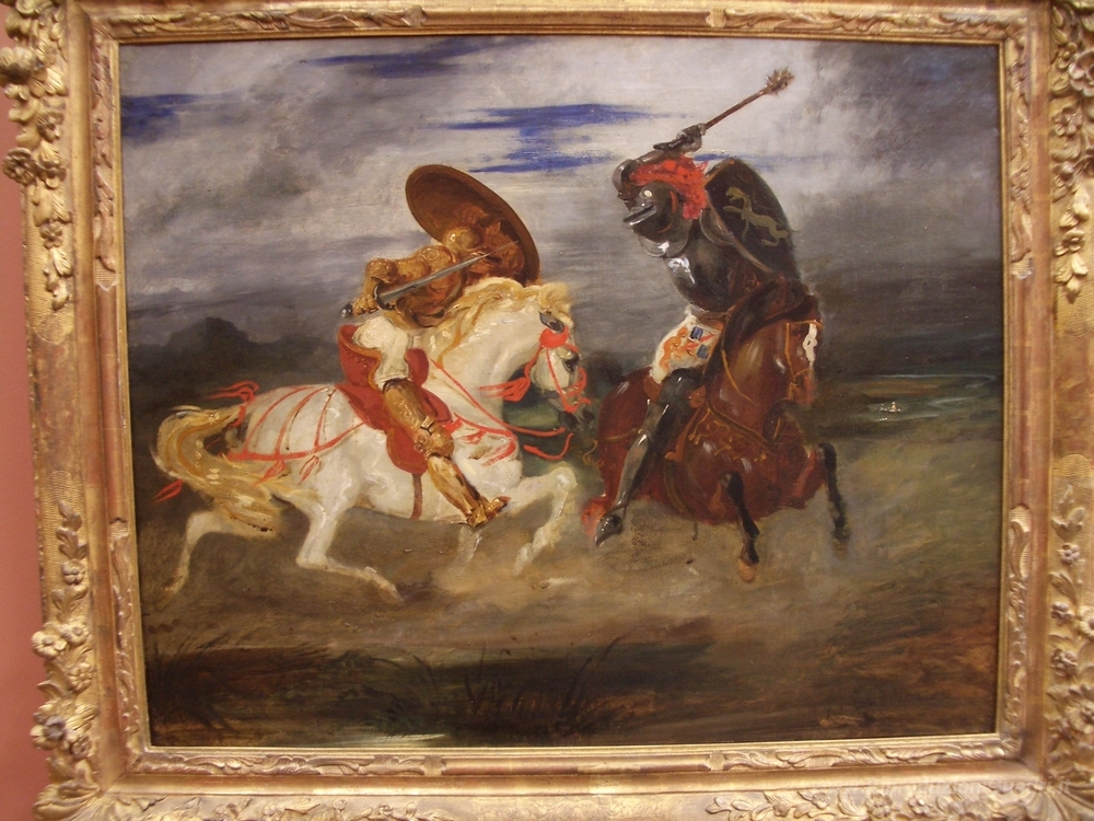 Ti offriamo una riproduzione artigianale su tela dell'opera famosa 'Il confronto di cavalieri in campagna' di Eugene Delacroix, dal Museo delle Riproduzioni.