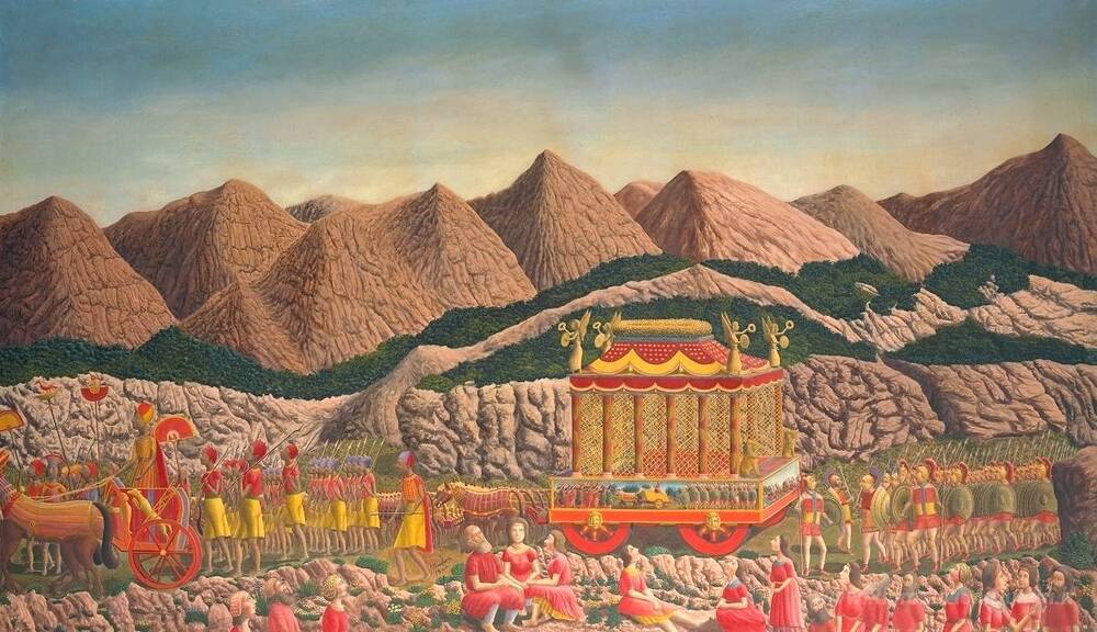 Ti offriamo una riproduzione artigianale su tela dell'opera famosa 'Il corteo funebre di Alessandro Magno' di Andre Bauchant, dal Museo delle Riproduzioni.