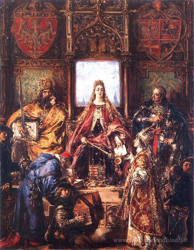 Ti offriamo una riproduzione artigianale su tela dell'opera famosa 'Il matrimonio di Jadwiga e Jagiello' di Jan Matejko, dal Museo delle Riproduzioni.