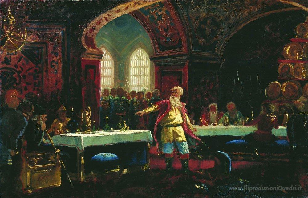 Ti offriamo una riproduzione artigianale su tela dell'opera famosa 'Il principe Repin al banchetto di Ivan il Terribile' di Konstantin Makovsky, dal Museo delle Riproduzioni.
