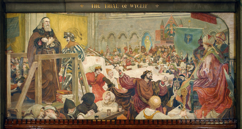 Ti offriamo una riproduzione artigianale su tela dell'opera famosa 'Il processo di Wycliffe dC' di Ford Madox Brown, dal Museo delle Riproduzioni.