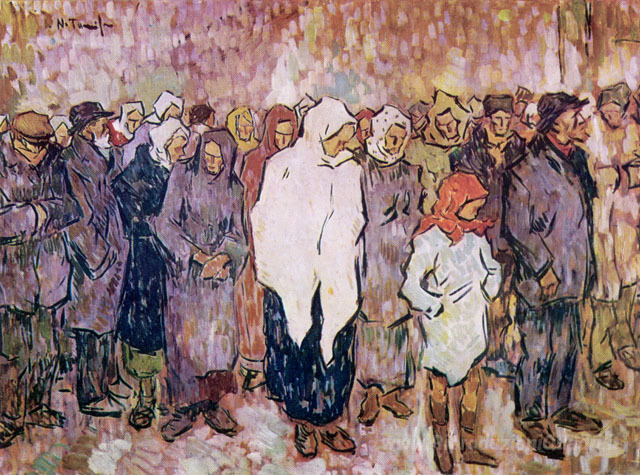 Ti offriamo una riproduzione artigianale su tela dell'opera famosa 'In coda per il pane' di Nicolae Tonitza, dal Museo delle Riproduzioni.