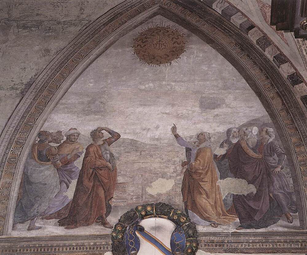 Ti offriamo una riproduzione artigianale su tela dell'opera famosa 'Incontro di Augusto e la Sibilla' di Domenico Ghirlandaio, dal Museo delle Riproduzioni.