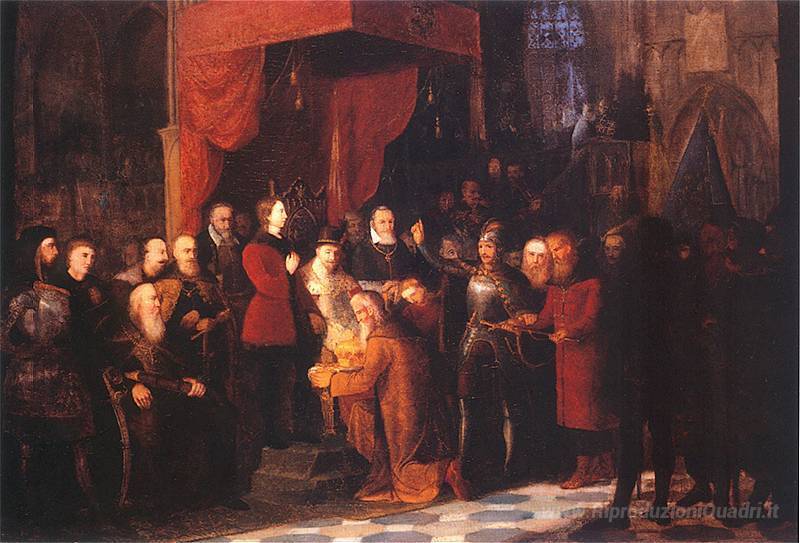 Ti offriamo una riproduzione artigianale su tela dell'opera famosa 'Incoronazione del primo re dC 1001' di Jan Matejko, dal Museo delle Riproduzioni.