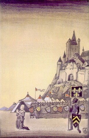 Ti offriamo una riproduzione artigianale su tela dell'opera famosa 'Jeanne d'Arc. Preghiera.' di Nicholas Roerich, dal Museo delle Riproduzioni.