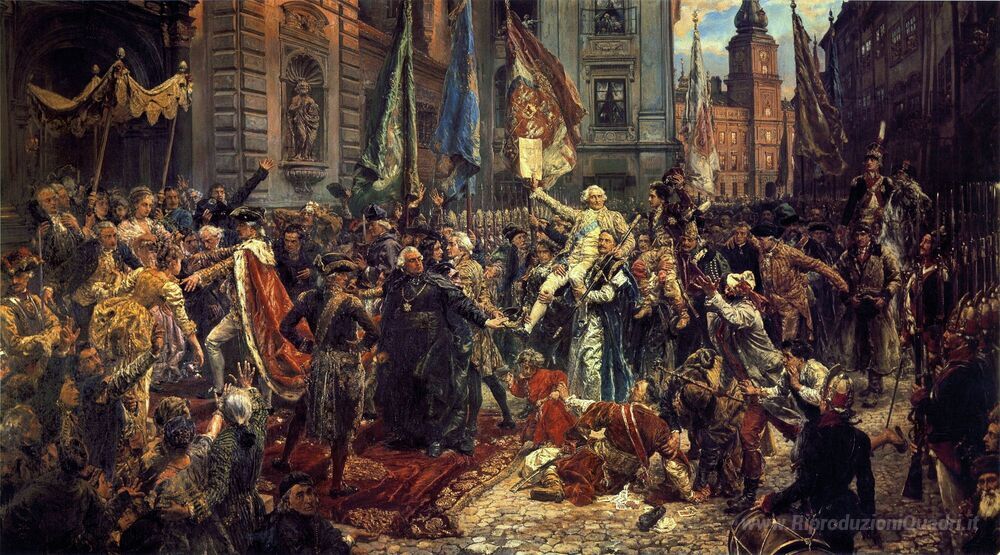 Ti offriamo una riproduzione artigianale su tela dell'opera famosa 'La Costituzione del 3 maggio, 1791' di Jan Matejko, dal Museo delle Riproduzioni.