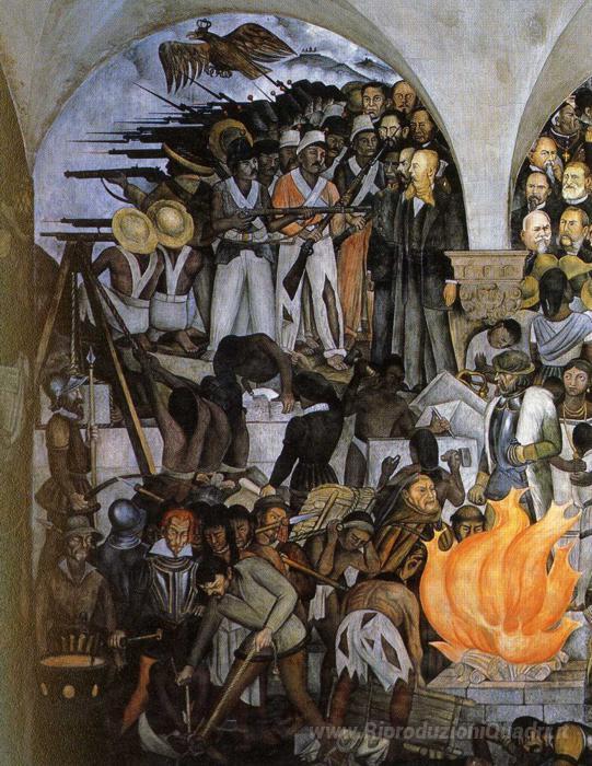Ti offriamo una riproduzione artigianale su tela dell'opera famosa 'La storia del Messico' di Diego Rivera, dal Museo delle Riproduzioni.