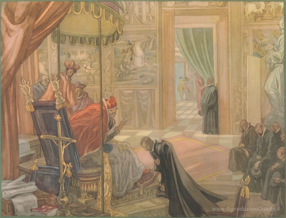 Ti offriamo una riproduzione artigianale su tela dell'opera famosa 'La vita di S. Ignazio di Loyola. Piatto 7. Papa Paolo III approv' di Carlos Saenz de Tejada, dal Museo delle Riproduzioni.